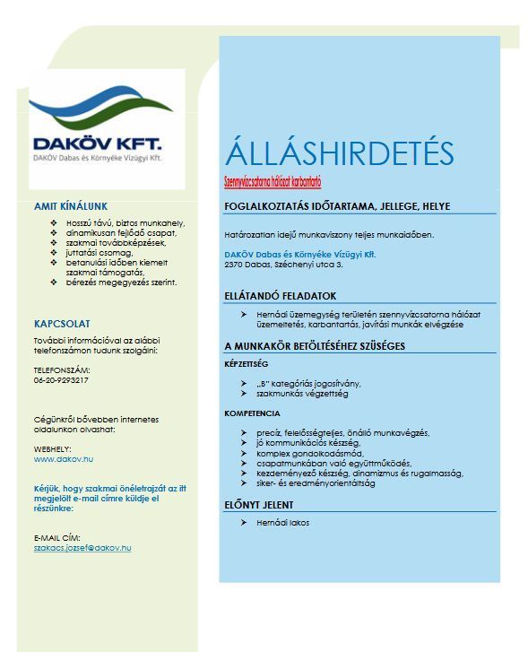 A DAKÖV Kft. felvételt hirdet szennyvízcsatorna karbantartói állásra