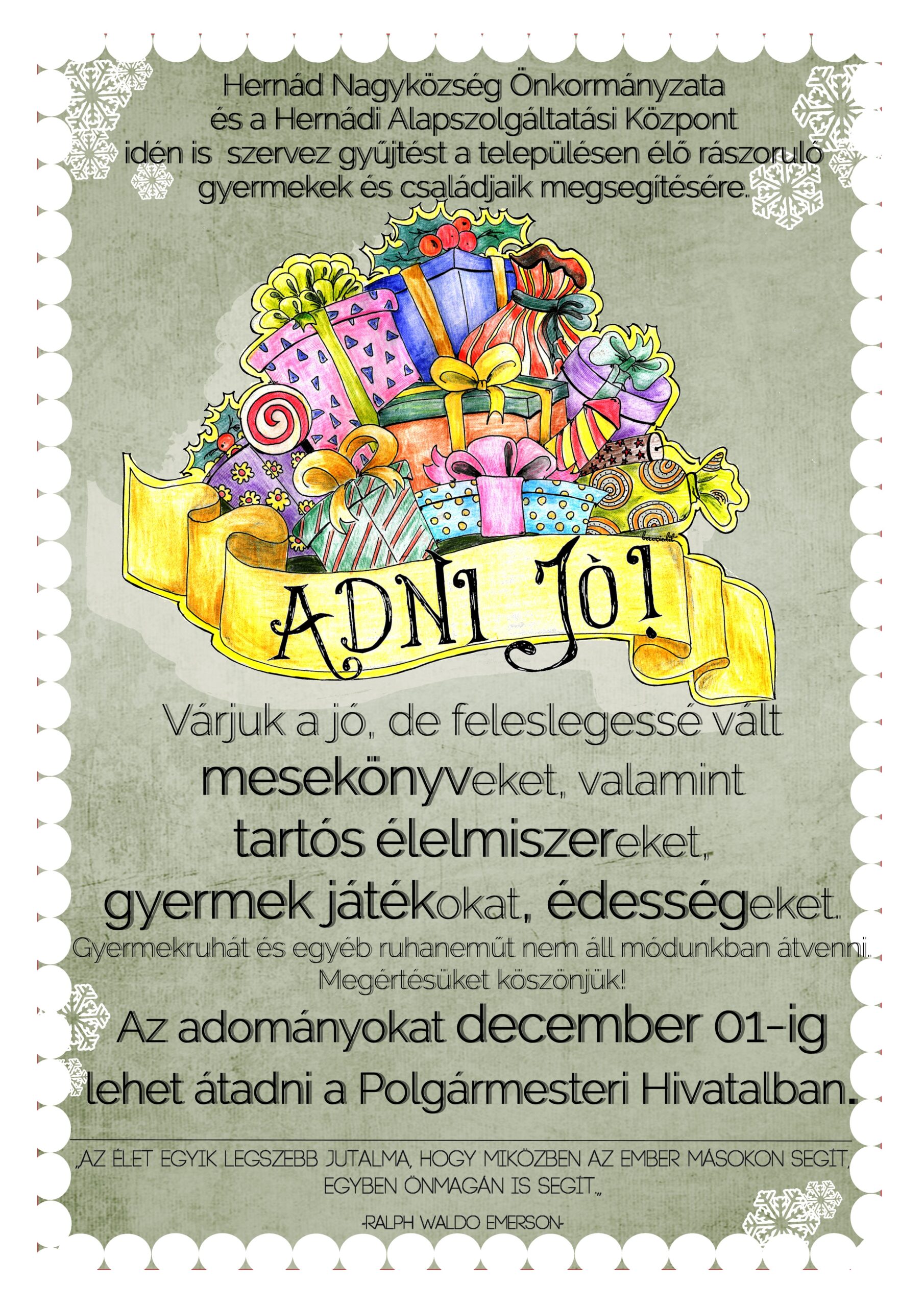 Hernád Nagyközség Önkormányzata és a Hernádi Alapszolgáltatási Központ ismét adománygyűjtést szervez, hogy szebbé tehessék a rászoruló családok karácsonyát. Kicsivel is segíthet! A részletek a plakáton. Köszönjük önzetlen adományaikat!