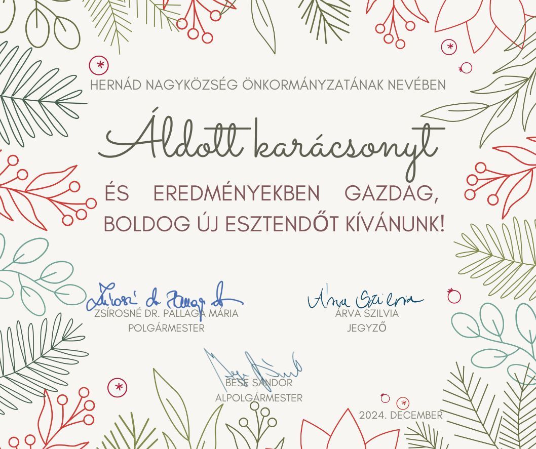 A magam, Hernád Nagyközség Önkormányzatának Képviselő-testülete, valamint minden önkormányzati dolgozónk nevében áldott karácsonyt, egészséget, békét és boldogságot kívánok minden hernádinak, minden magyarnak és minden embertársunknak.