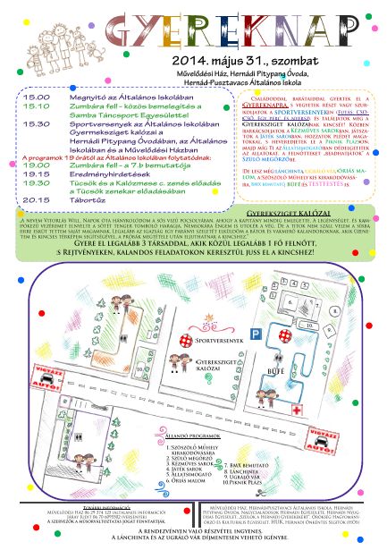 gyereknap_plakat Május 31-én délután gazdag gyermeknapi programmal várják a gyerekeket és szüleiket az iskola, óvoda és a művelődési ház környékén. Jöjjenek el minél többen!